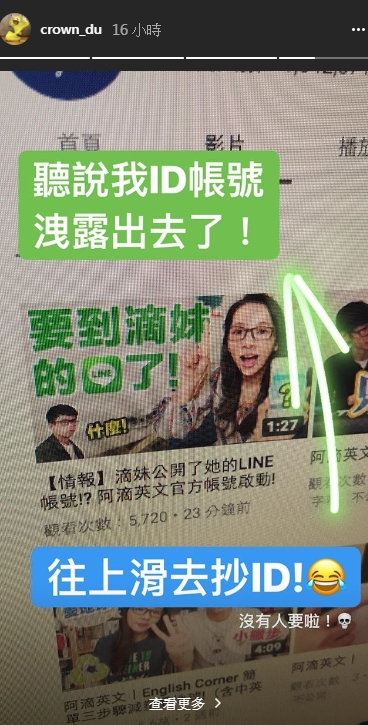 3日時滴妹在IG的限時動態中發布了一張圖片,寫著「聽說我ID帳號洩漏出去了,往上滑去抄ID」,原來是阿滴英文頻道發布了最新影片「【情報】滴妹公開了她的LINE帳號!? 阿滴英文官方帳號啟動!」兩人開心的宣布成立官方帳號,也表示未來會推出更多限定的活動在上面,希望大家可以多多追蹤。