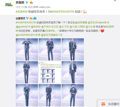 近日,9%傳出令粉絲們都相當開心的好消息,就是他們即將要參與知名的大陸綜藝節目《奔跑吧》的錄製,《奔跑吧》微博也證實了這個消息,但官方照片中卻唯獨缺乏了一位成員,《練習生》中以第一名之姿出道的蔡徐坤。