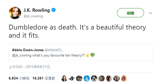 網友如偵探般的推敲也獲得作者J.K羅琳的讚賞,在Twitter上回覆:「鄧不利多是死神,這是個浪漫的理論,而且非常貼切!」