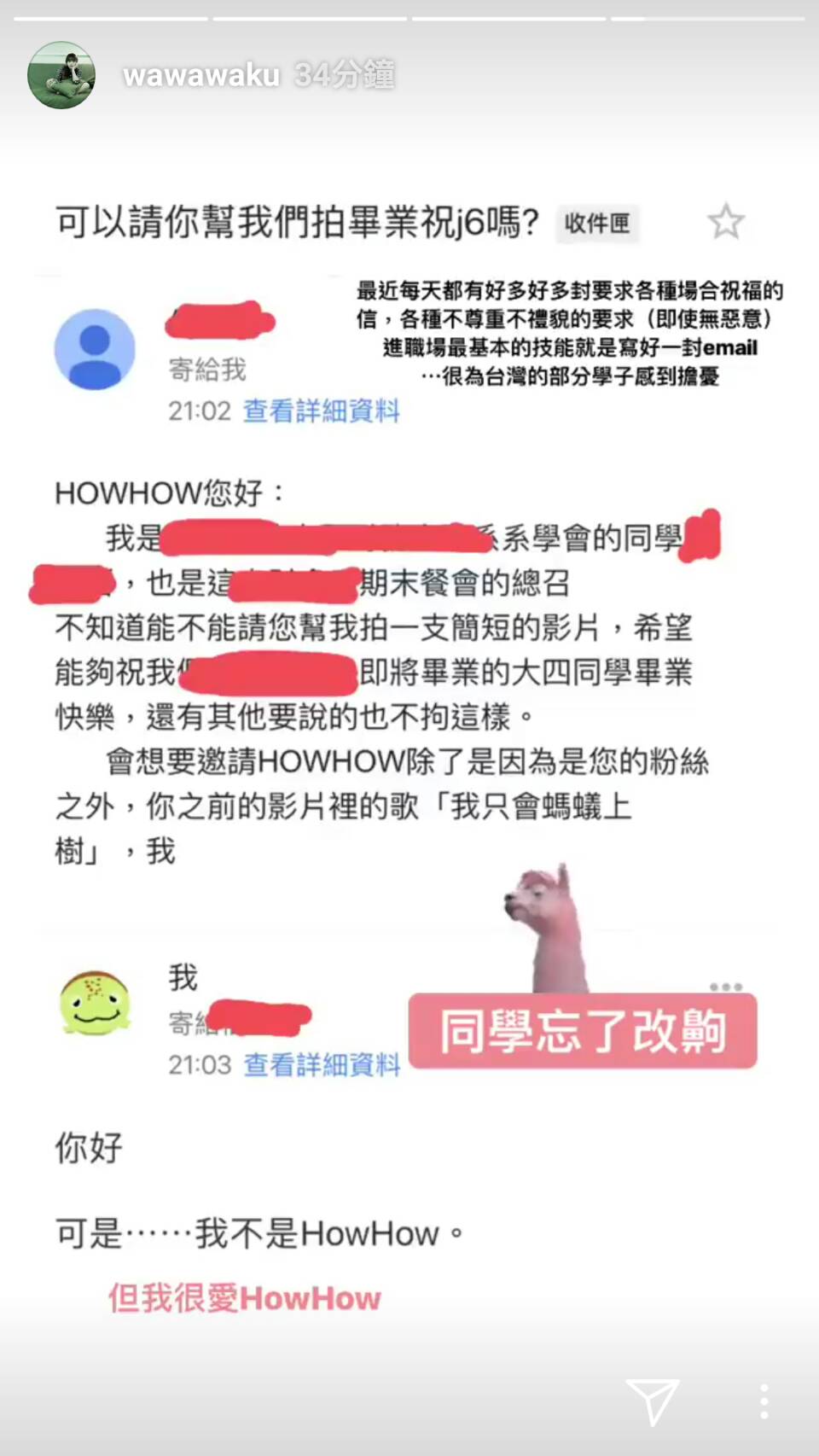 只見同學的來信內容應該是要寄給howhow的,但是內文疑似也沒打完,主旨也有點錯誤,對此古娃娃表示「最近每天都有好多好多封要求各種場合祝福的信,各種不尊重不禮貌的要求(即使無惡意)進職場最基本的技能就是寫好一封email….很為台灣的部分學子感到擔憂」並在來信上標註「同學忘了改齁」,不過仍非常貼心的為同學緩頰「但我很愛howhow」。