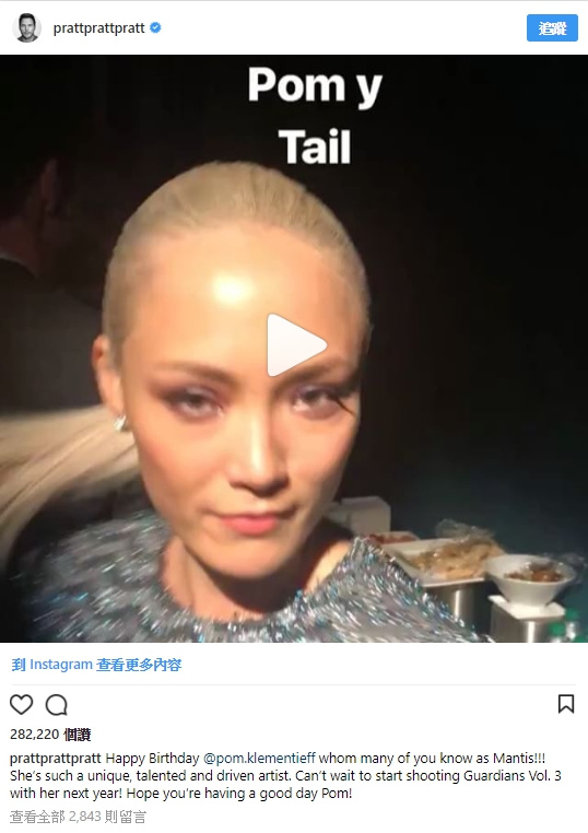 ▼克里斯普瑞特(Chris Pratt)在 IG 上 PO 出影片祝「螳螂女」龐克萊門捷夫(Pom Klementieff)生日快樂,以外透露了《星際異攻隊 3 》即將在明年開拍的消息。