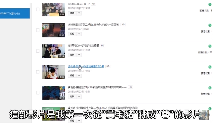 接著,他帶著大家看他之前的影片,技術尚不純熟的影片技巧及模樣,讓他感嘆「我真的不之知道我那時候怎麼會有勇氣拍片」,他表示,自己當時的訂閱只有1,而那個訂閱的人就是他自己。尊也曝光當初看了阿神的影片後,自己翻拍的成果,然後自己調侃自己「我就是從2012年開始抄襲別人到現在2018年」而這些影片現在都已經看不到了,因為尊已經將它們通通鎖起來了,他認為「這根本就是黑歷史」。