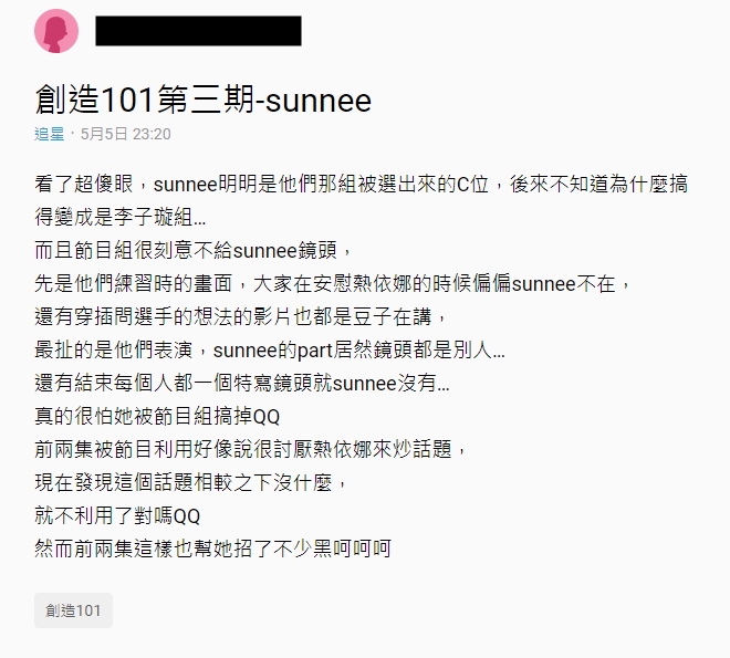 而近日,一段「《創造101》第三集Sunnee未被剪鏡頭的影片」在網路上流傳,影片中可見導師們認真討論分別選出能力C位及勤奮C位,而Sunnee被選為勤奮C位之一,接著,演出前身為隊長的Sunnee也代表發言,開玩笑的表示他們隊沒有敵隊來的漂亮,是「醜隊」,但是也希望大家支持多多支持他們,把票投給他們。Sunnee隊以精彩演出魔力紅的歌曲《Sugar》,完美的走位及團隊默契更贏得滿堂喝采,也順利打敗吳宣儀隊。但網友們也發現應該是C位的Sunnee,演出時卻不是C位,而是由另一名成員李子璇取代C位的位置,與前面的節目內容前後矛盾,也幾乎沒有她的單獨演出鏡頭。