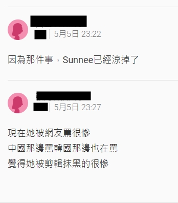 但在第3集的《創造101》中,Sunnee曝光畫面卻少得可憐,明明是隊長,團體中練習的畫面她卻完全沒入鏡,正式演出時也幾乎沒有特寫,存在感相較前兩集大大降低。對此,有大陸網友爆料疑似是Sunnee所屬的經紀公司「可米領譽」與《創造101》節目組的「騰訊」發生問題,她因而受到牽連。此外,Sunnee亦被爆出對其他練習生有過多的肢體接觸,讓她的人氣瞬間大幅下降,更引發罵聲一片。