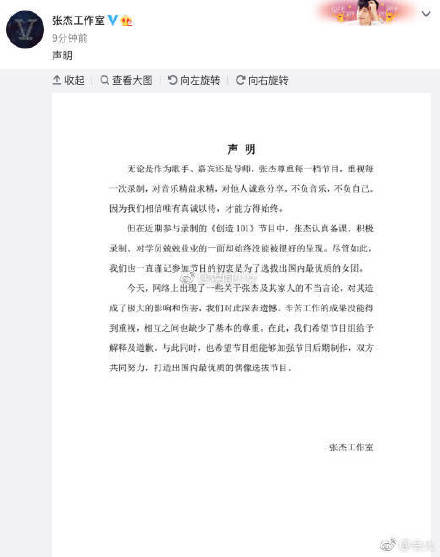 對此,張杰工作室也在5月9日發布聲明,「今天網路上出現了一些關於張杰及其家人的不當言論,對其造成了極大影響和傷害。張傑擔任某節目導師以來認真備課積極錄製,很遺憾辛苦工作成果沒能得到重視。工作室希望該節目組給予解釋及道歉,同時也希望節目組能夠加強節目後期製作。」正面回應網友的言論。