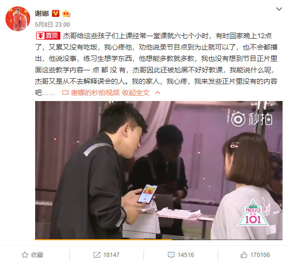 而張杰的老婆謝娜心疼老公無故被罵,也連發兩則貼文立挺老公「杰哥給這些孩子們上課經常一堂課就6、7個小時,有時回家晚上12點了,又累又沒有吃飯。」她心疼老公要他點到就好,畢竟不會全部呈現在節目中,但老公卻回他「練習生想學東西,能多教就多教。」謝娜更無奈的表示:「沒想到節目正片裡面這些教學內容一點都沒有,杰哥還因此被尬黑不好好教課,我能說什麼呢?杰哥又是從不去解釋誤會的人,我的家人,我心疼。」為老公打抱不平,也轉發節目花絮影片,希望網友們能夠了解,張杰並非擺爛,反之他相當的用心在對待練習生們。
