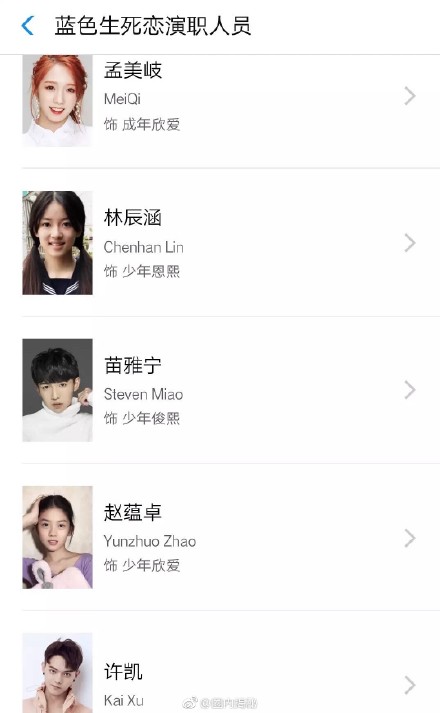 9日網傳出陸版《藍色生死戀》將在8月播出,其中女二「芯愛」這個角色則由《創造101》當中的高人氣練習生孟美岐擔綱。而公開的演員名單中,除了孟美岐是演芯愛之外,少女恩熙、少年俊熙及少女芯愛,分別由林辰涵、苗雅寧及趙蘊卓飾演,消息傳出之後多數網友非常震驚直問:「拍好了?悄悄的?」雖然實在是太突然了,但也有許多網友非常期待!