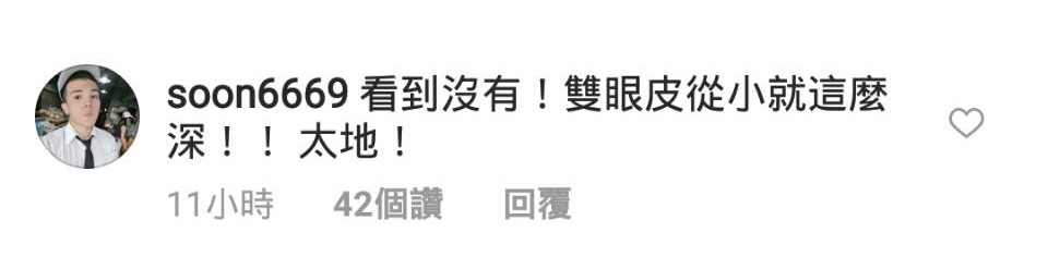 網友們看到也紛紛留言「都沒什麼變 」、「好可愛哦哈哈哈 」、「你的改變我看的見 」、「哈哈怎麼那麼可愛 」、「國小就那麼帥了 」、「小時候就看起來很ㄎㄧㄤ了 」、「ㄧ臉的慈眉善目 」、「現在未免也太帥了吧 」、「從小面相就看得出來長大一定不平凡 地~ 」他自己也搞笑留言「看到沒有!雙眼皮從小就這麼深!! 太地! 」、「這小胖子很帥嘛」。