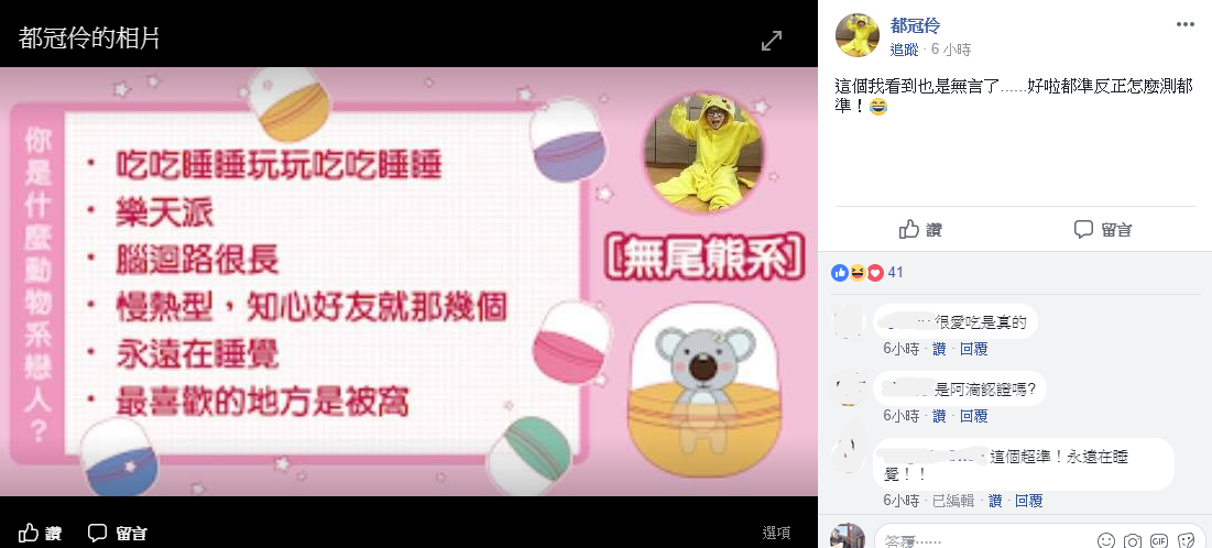 有趣的是滴妹也在留言區放上了自己第一次測的結果,並且說:「我覺得某人一定會超級認可」意有所指的文字讓網友紛紛猜測是誰。而滴妹第一次測的結果就是「無尾熊系戀人」,特徵有『吃吃睡睡玩玩吃吃睡睡、樂天派、腦迴路很長、慢熟型,知心好友就那幾個、永遠在睡覺、最喜歡的地方是被窩』超級懶惰XD 但喜歡滴妹的粉絲可以不用太傷心,滴妹在下方對於網友:「某人是誰????」的疑問已經親自回應:「還有誰 我家那位啊」應該就是指國民大舅子阿滴了。不過也希望滴妹趕緊找到自己的幸福!