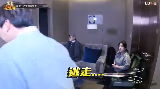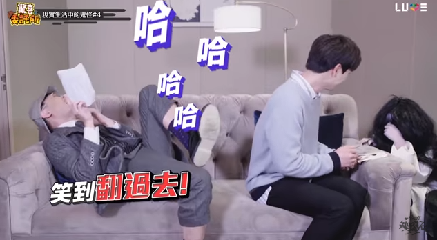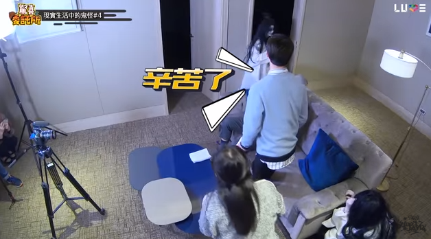 後來白衣女鬼更開始朝陸星材移動,嚇得他跳起來更跑到一邊。不過荒謬的是,女鬼還安排要跟陸星材要簽名,聖結石在一旁完全笑翻XD 後來陸星材冷靜下來,明明一直被整的他,還貼心幫女鬼簽名,也用中文對兩個假扮女鬼的工作人員說:「辛苦了」超級暖心!但後來雖然整人已經結束,兩個女鬼站在沙發後面卻還是讓我們星材又被嚇到XD