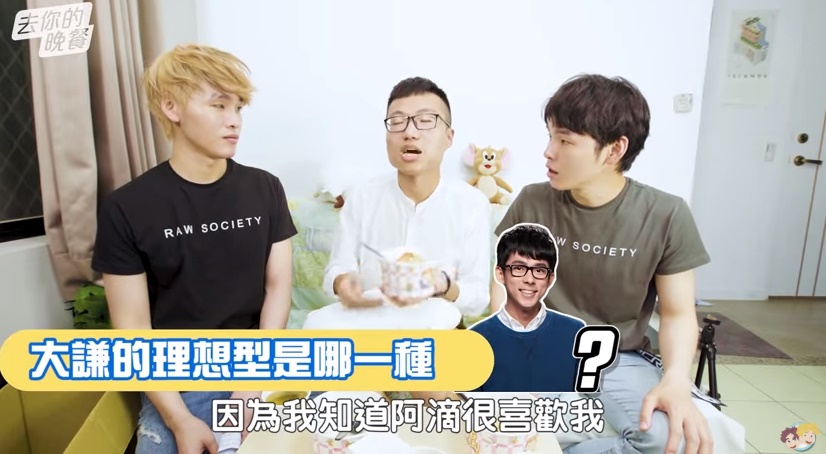 至於被問到自己的理想型?大謙則是秒回「阿滴」,令展瑞及展瑞相當吃驚,接著大謙解釋道,「因為我知道阿滴很喜歡我,所以我就是順從他的慾望」,而展瑞及展瑞聽到後,也一口同聲地說「他也說他喜歡我耶!」,讓大家三人紛紛大喊「阿滴你到底愛誰?」要他回應到底要哪一個。