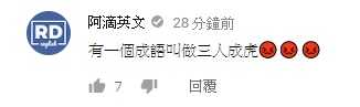 而阿滴看到後,也在影片下方留言「有一個成語叫做三人成虎 」並加上三個憤怒的表情符號,疑似在控訴他們三個聯合一起說他壞話,相當可愛。