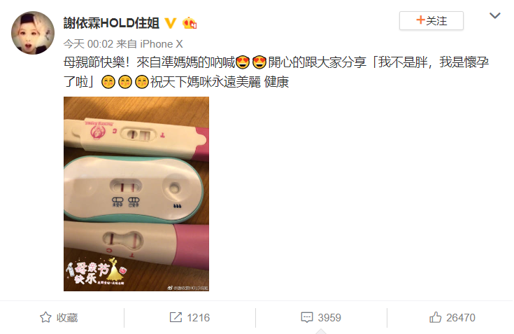 沒想到婚事才剛傳出不久,昨天晚上謝依霖又在母親節前夕丟下一顆震撼彈:「母親節快樂!來自準媽媽的吶喊~開心的跟大家分享『我不是胖,我是懷孕了啦』祝天下媽咪永遠美麗、健康。」