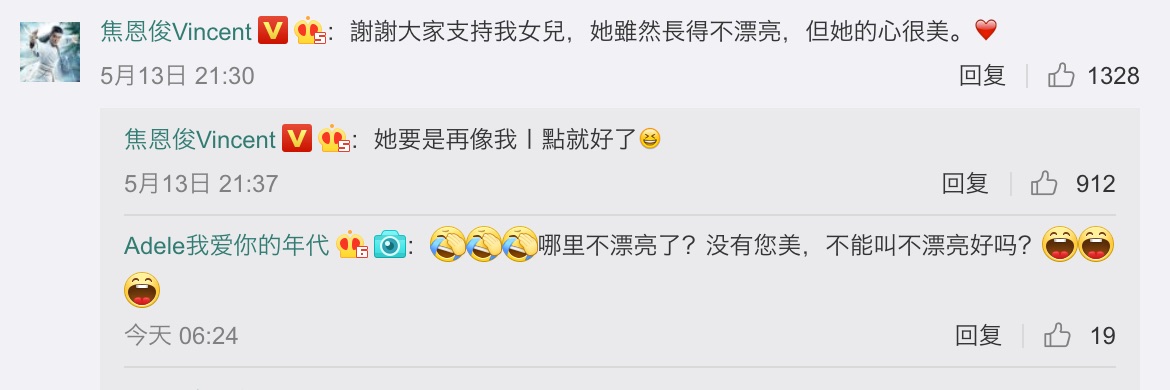 播出當日,焦恩俊就在微博轉發女兒晉級的消息,提到「不論名次,真誠待人,認真面對,焦家人之精神,加油」,讓人看了直呼好溫馨,還是自家人挺自家人!但話鋒一轉,焦恩俊又在留言道:「謝謝大家支持我女兒,她雖然長得不漂亮,但她的心很美」