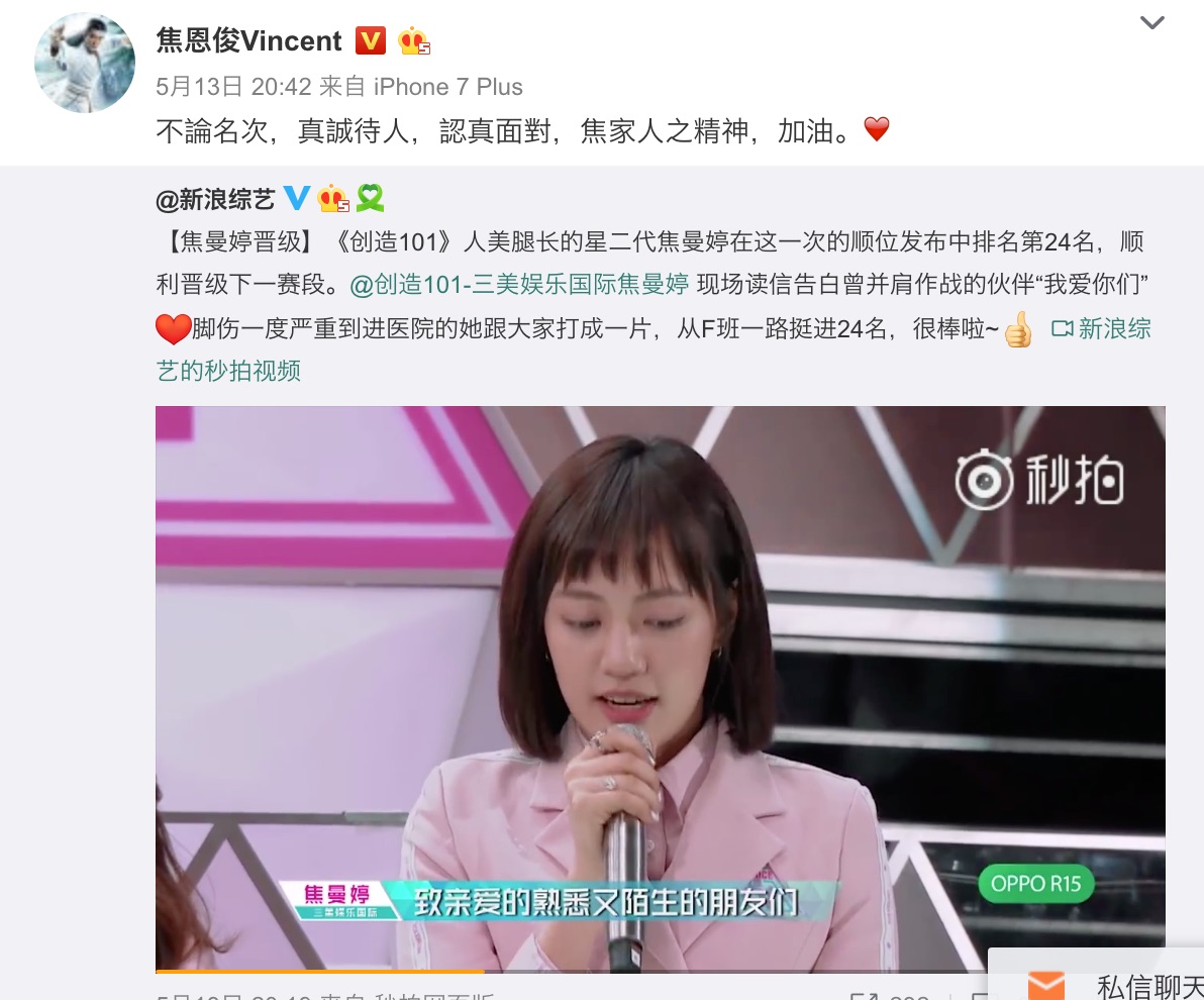 大陸選秀節目跟韓國的Produce 101買版權,推出創造101,培育出不少話題人物,裡面也有不少是星二代或是之前就已經出道過的藝人,而焦恩俊的女兒焦曼婷也在13日播出的淘汰賽後第一次排名中獲得第24名,焦恩俊也在自己的微博替女兒打氣。