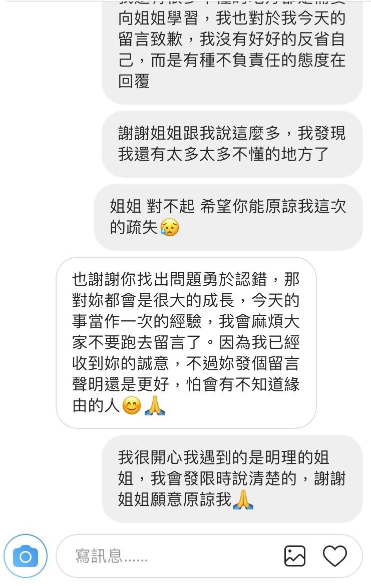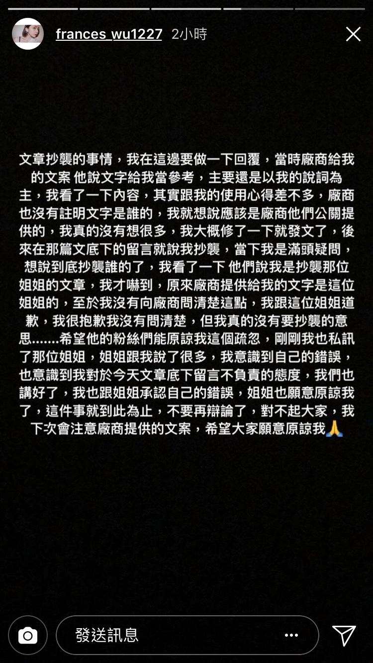 後來在那篇文底下的留言就說我抄襲,當下我是滿頭問號,想說到底抄襲誰了,我看了一下,他們說我是抄襲那位姊姊的文章,我才嚇到,原來廠商提供給我的文字是這位姐姐的,至於我沒有向廠商問清楚這點,我跟這位姐姐道歉,我很抱歉我沒有問清楚,但我真的沒有要抄襲的意思……希望她的粉絲能原諒我這個疏忽,剛剛我也私訊了那位姐姐,姐姐跟我說了很多,我意識到我對於今天文章底下留言不負責任的態度,我們也講好了,我也跟姊姊承認自己的錯誤,姐姐也願意原諒我了,這件事就到此為止,不要再辯論了,對不起大家,我下次會注意廠商提供的文案,希望大家願意原諒我。