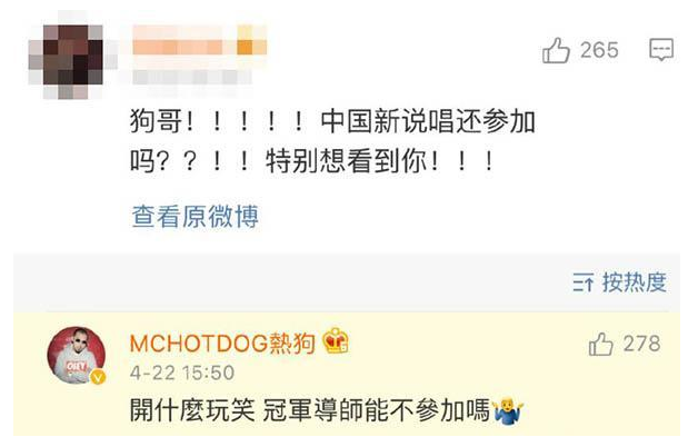不過就在所有人都認為《中國有嘻哈》應該不會再出第二季時,《中國新說唱》卻已經強勢來襲,原來是第一季改頭換面重新出發。第一季最受歡迎的導師「吳亦凡」也曬出了官方視頻宣布回歸,官方更公布華人嘻哈文化的驕傲「歐陽靖」也將擔任此次節目的導師。除此之外網路上也盛傳熱狗,張震嶽、潘瑋柏繼續出任的消息。有趣的是雖然官方尚未公布,但熱狗對於網友的猜測親自回應:「開什麼玩笑 冠軍導師能不參加嗎?」直接證實了自己將要回歸《中國新說唱》的消息。