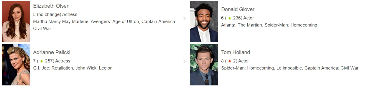 ▼第 5 名正是長年受到影迷喜愛的「緋紅女巫」伊莉莎白歐森,第 6 名的演員唐納·格洛弗,則是在《蜘蛛人:返校日》飾演試圖從圖姆斯的手下買武器的罪犯「亞倫」,讓他熱門度直升的原因則是美劇《亞特蘭大》(Atlanta)。第 7 名是《特種部隊 2:正面對決》的主要演員安卓恩·帕利奇,她也以美劇《神盾局特工》參與了漫威戲劇。第 8 名則是由「蜘蛛人」湯姆荷蘭上榜。