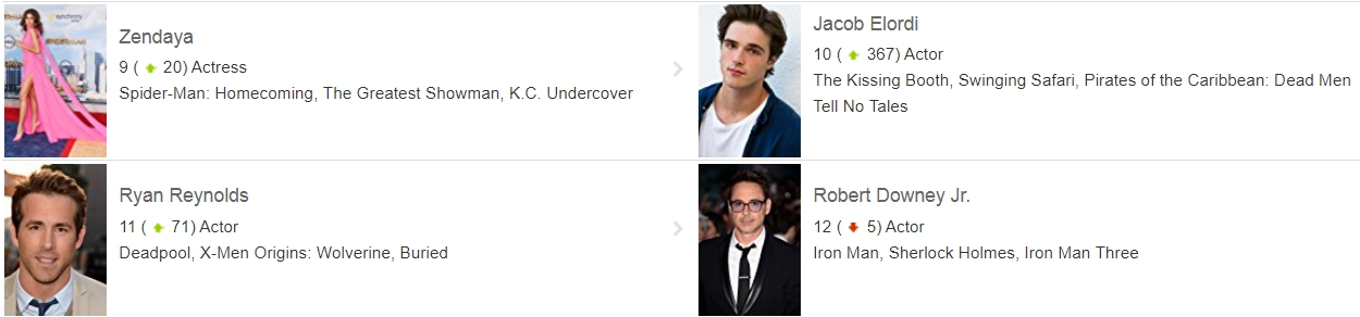 ▼第 9 名則是《蜘蛛人:返校日》的蜜雪兒,演員贊達亞去年演出的音樂電影《大娛樂家》也相當火紅。第 10 名則是由演出青春電影《The Kissing Booth》而爆紅的 20 歲新生代帥哥演員拿下,連「死侍」萊恩雷諾斯和「鋼鐵人」小勞勃道尼都被壓在底下。不過光是 IMDb 演員熱度排行榜前 10 名就有 8 位來自漫威電影宇宙,還有 1 位也是《神盾局特工》的演員,可以見得漫威宇宙真的要把半個好萊塢的演員都給包下來了。