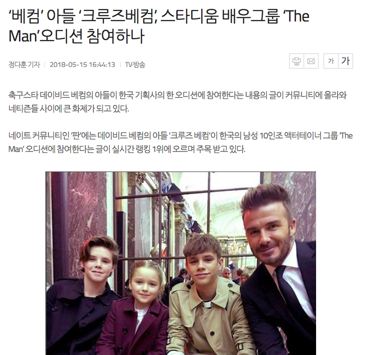 然而近日貝克漢的13歲小兒子克魯茲·貝克漢傳出將參與韓國10人男團「The Man」的選秀面試,消息一出,網路造成不小熱議!克魯茲·貝克漢姆(Cruz Beckham)是大衛·貝克漢姆和維多利亞·貝克漢姆的小兒子。2005年2月20日出生於西班牙,克魯茲·貝克漢姆名字Cruz,取自西班牙語「十字架」之意。小小年紀的他已經是家喻戶曉,成為眾人眼中的偶像明星。喜愛歌唱的他,也曾發表過聖誕單曲,歌唱實力備受矚目,更自許成為下一個小賈斯汀(Justin Bieber)。