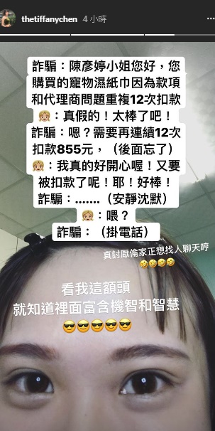 詐騙:陳彥婷小姐您好,您購買的寵物濕紙巾因為款項和代理商的問題重複12次扣款