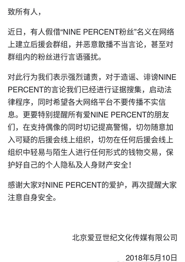 對此,NINE PERCENT所屬公司北京愛豆世紀文化傳媒有限公司也於5月10日發表聲明:
