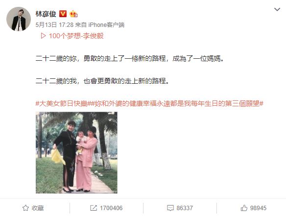 《偶像練習生》男團「nine percent」自4月6日出道後,便集體前往LA受訓,回國後除了參加《跑男》、《大熱門》等超夯陸綜外,巡迴表演以及廣告代言也是接不完。而5月13日的母親節,林彥俊透過微博PO出與媽媽的合照,照片當中的媽媽正值年輕貌美的22歲,旁邊則是外婆正抱著還嗷嗷待哺的林彥俊小寶寶,林媽媽的陽光燦笑與深邃酒窩和林彥俊簡直如出一轍。林彥俊透過微博向媽媽表示感恩並期許自己變得更好,感動不少網友們。