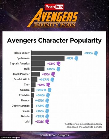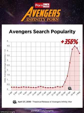 而根據全球最大的A片網站Pornhub近日公布的統計數字顯示,自從《復仇者聯盟3:無限之戰》上映後,隨著影片的熱潮,有關漫威超級英雄的系列色情影片被搜尋的次數明顯暴增,增加了超過356%,非常驚人。