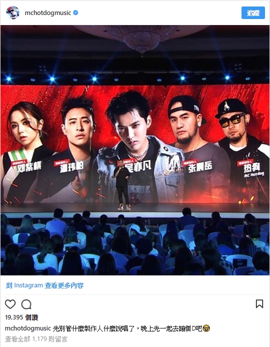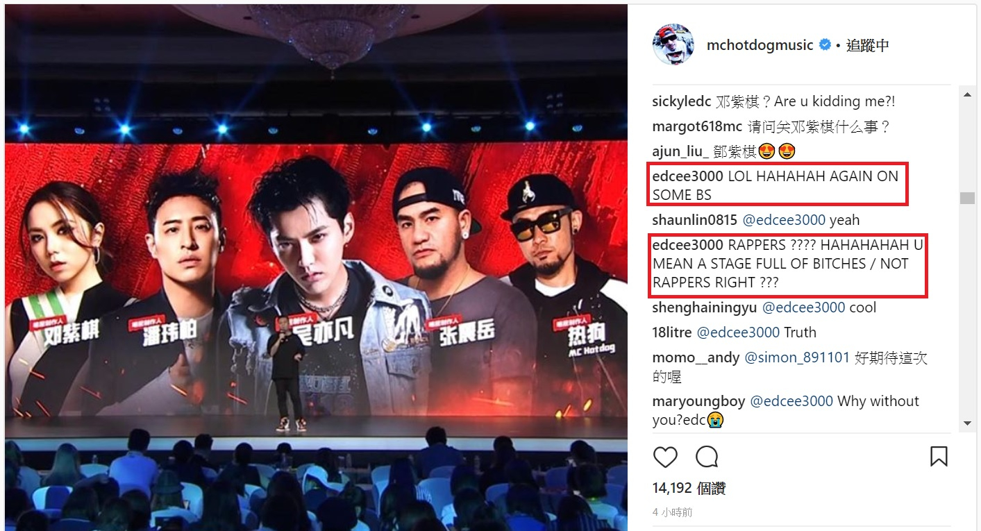 中國嘻哈選秀節目「中國新說唱」〈原中國有嘻哈〉繼先前公布了北美區的重量級評審之後,今天則正式公布了全新一季的嘻哈導師陣容,新一季的明星製作人以原班人馬 Kris wu 吳亦凡、熱狗 & 張震岳、潘瑋柏為主,除此之外還多增加了一位女性製作人「鄧紫棋」。而身為導師之一的熱狗 MC HOT DOG 更是在消息一公布後立刻在 IG 跟大家分享,但網友們也在留言區針對這次的導師陣容不斷質疑,像是以情歌風格為主的鄧紫棋憑什麼可以擔任嘻哈選秀的評審?或是問說為什麼之前網傳的「陳冠希」與「王嘉爾」不是最終的導師群?而就在一片熱烈的討論串之中,編輯意外發現事主之一的「陳冠希」竟然也現身留言區並開炮「LOL HAHAHAH AGAIN ON SOME BS」、「RAPPERS ???? HAHAHAHAH U MEAN A STAGE FULL OF BITCHES / NOT RAPPERS RIGHT ???」表示出對於這一季明星製作人的陣容感到相當質疑,並且不改他大砲性格直呼這些評審都是一群婊子而不是真正的饒舌歌手。