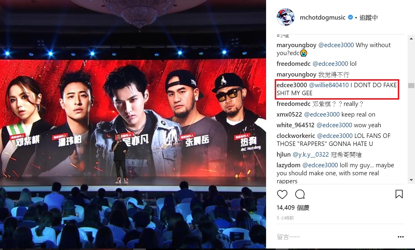 同時 EDC 也針對網友問說「為什麼沒有陳冠希」做出回應表示「I DONT DO FAKE SHIT MY GEE」,強烈傳達出他不滿的情緒。