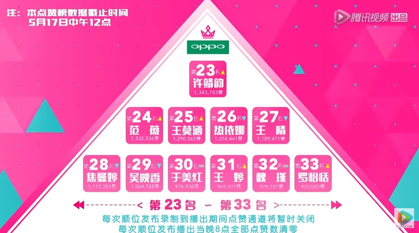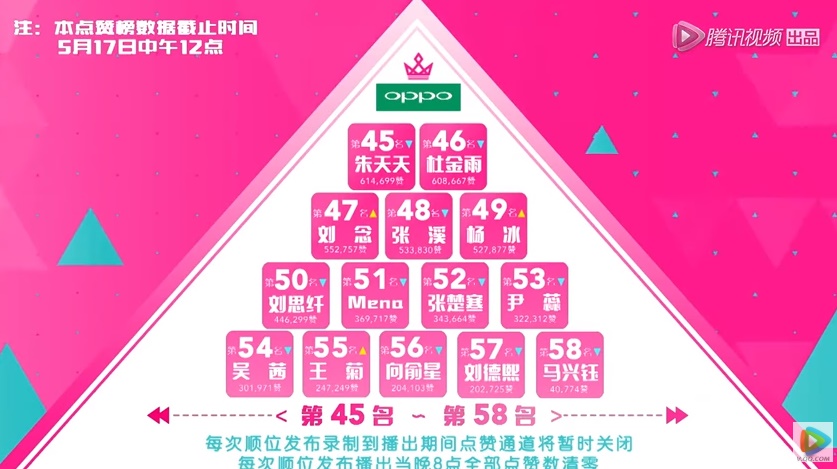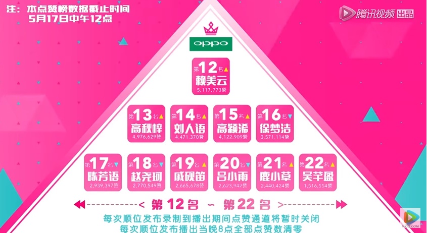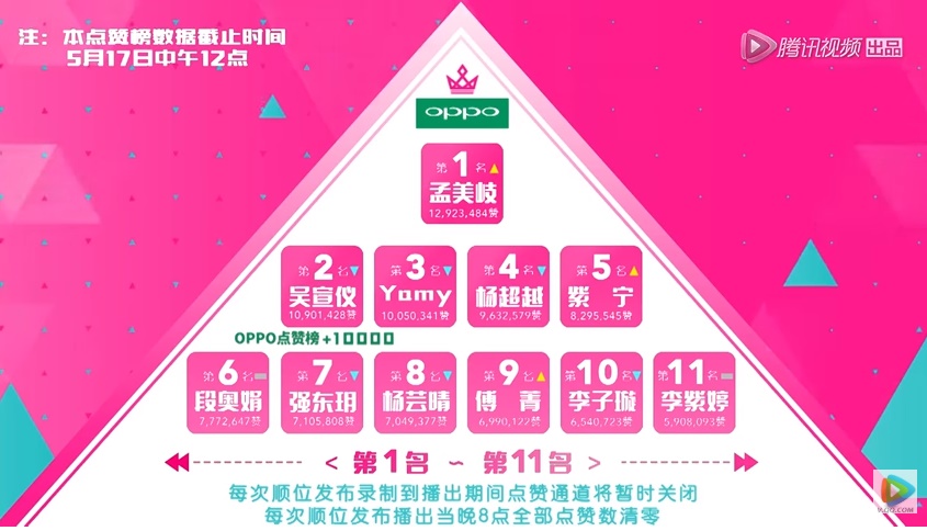 前集的最終排名分別是由吳宣儀、Yamy、楊超越、孟美岐、強東玥、段奧娟、Sunnee、陳芳語、李子璇、傅菁和李紫婷拿下。而在5月19日播出的最新一集的最新總排名中,原本排在第一個吳宣儀則成了孟美岐,第8的陳芳語被擠到11外,成為第17名的練習生,排名和上禮拜有著極大的差異,孟美岐從第四爬到了第一,練習生紫寧則逆風翻盤直接衝到第五,最新排名的前11名分別是孟美岐、吳宣儀、Yamy、楊超越、紫寧、段奧娟、強東玥、Sunnee、傅菁、李子璇和李紫婷