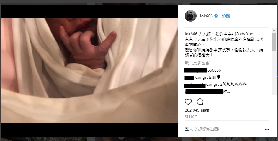 港星余文樂年底與台灣模特兒王棠雲結婚,今年5月10日王棠雲在香港剖腹生下兒子,小倆口家庭又多了一個新成員,36歲的余文樂升格當爸爸。兒子出生當晚,余文樂就在IG上大方公開自己兒子的小手照片,寫下: