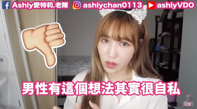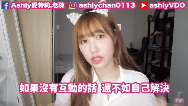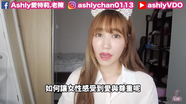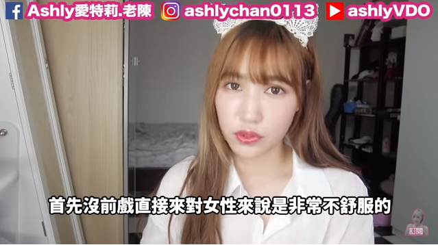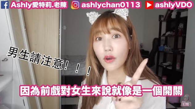 18日Ashly在自己的頻道ashlyVDO中上傳了新影片《男友不前戲直接來》,影片中直截了當的說明沒前戲直接來對女生來說是非常不舒服的,Ashly更說這樣的男生非常自私,並且直說「如果沒有互動的話,還不如自己解決」,解釋前夕對女生而言就像是開關一樣非常重要,並且前戲的存在才能讓女生覺得被愛與尊重,語重心長的呼籲男性觀眾。