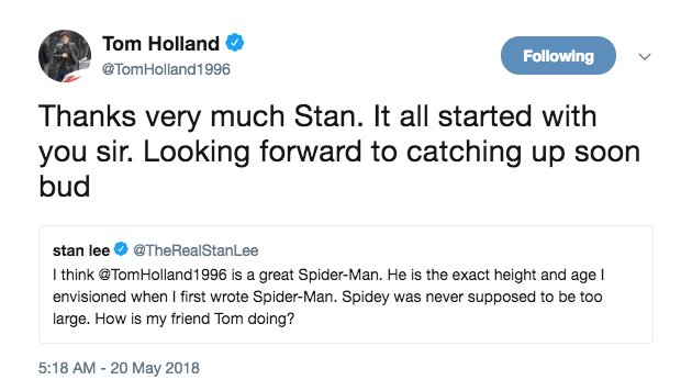 ▼湯姆荷蘭獲得漫威大人物的讚賞之後,也開心又俏皮地回覆:「非常感謝你 Stan,這一切都是由你開始的,期待很快與你相見兄弟。」喊著史丹李為兄弟的湯姆荷蘭,與這位漫威之父成為了可愛的忘年之交。