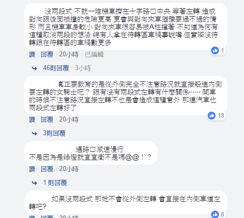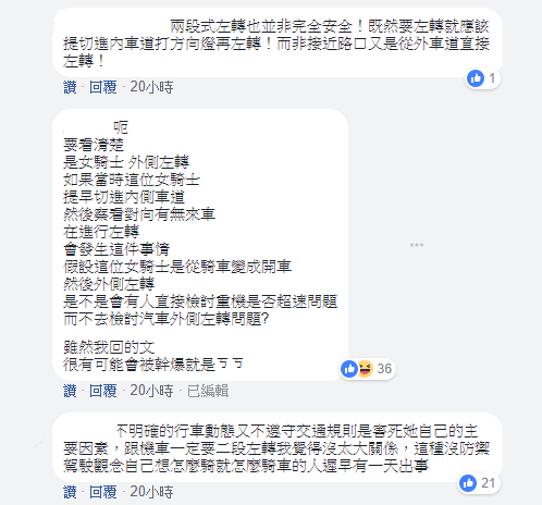 雖然486先生沒有惡意,但這番話卻引起了網友的論戰,更有人痛批他根本搞錯。網友表示在這個事件當中,並不是因為「沒有兩段式左轉」而發生事故,而是這位女騎士外線直接左轉才造成事故。而網友也在下方針對兩段式左轉的存廢議題重新進行討論,多數網友都認為,不論如何台灣的交通規則還是存在著問題,是需要再經過修正的。