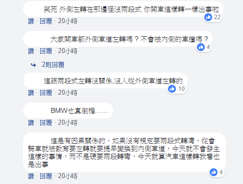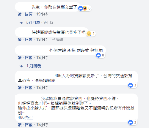 而對於486先生把事故關鍵原因歸咎於「沒有兩段式左轉」,許多網友也毫不留情的直說:「486先生真的該更新資訊」、「臺灣講話很有深度的人一碰到交通腦袋都會打結講幹話」、「你開車怎麼轉,騎車就突然不會了?」、「先生,你敗在這篇文章了」、「好好賣東西吧⋯這種議題你就別碰了。」、「臉伸出來給人打」!
