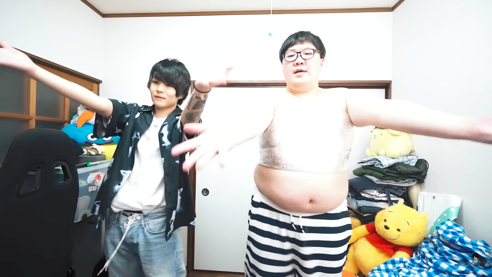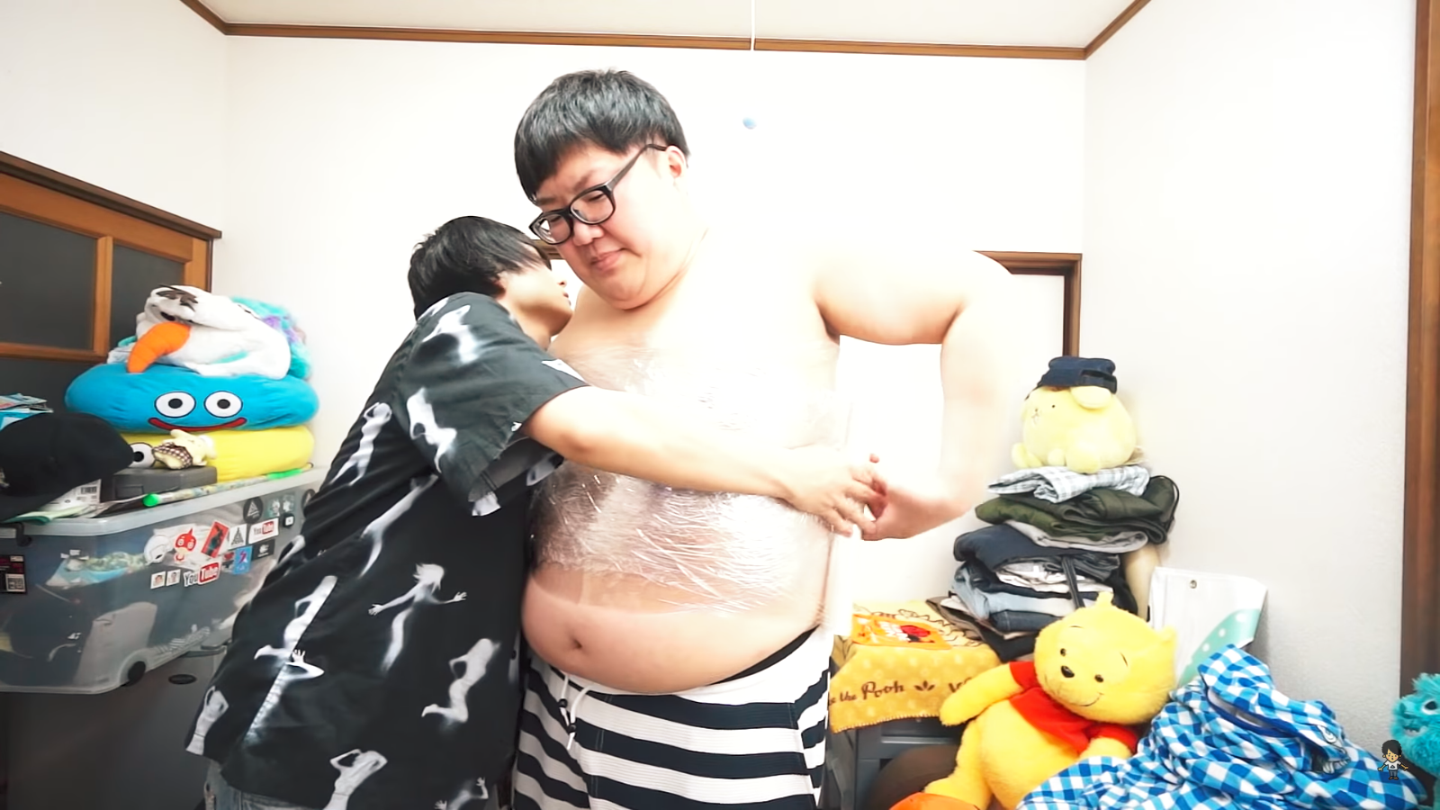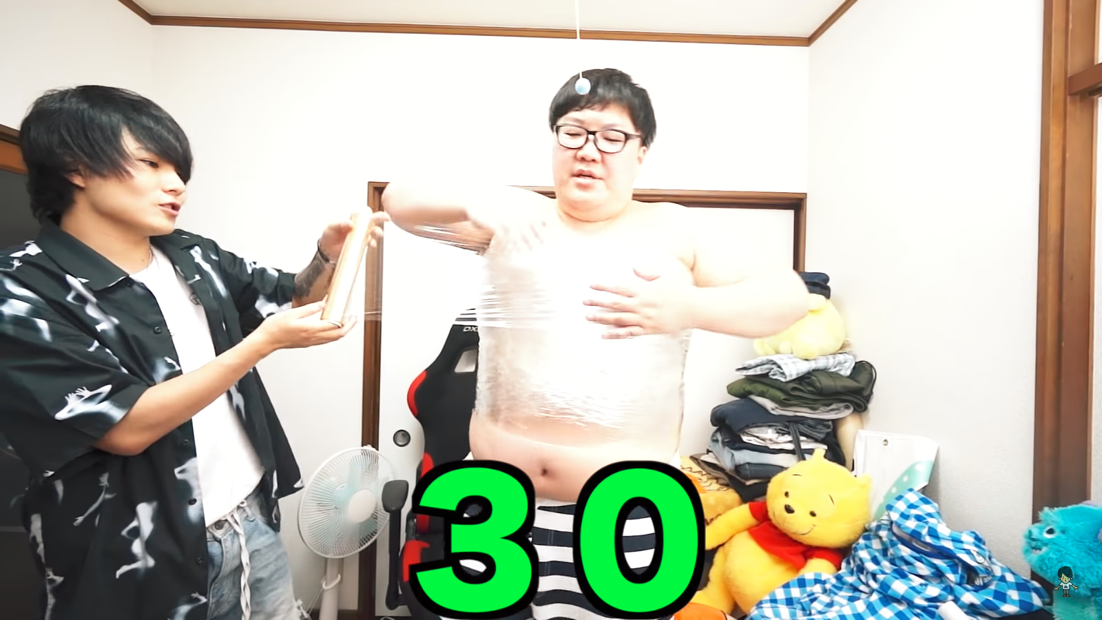 而因為DEKAKIN的胸部比較大,兩人也搞笑地以PFPF Channel的名義,試拍了兩個影片。第一個主題是:「用幾張保鮮膜才能遮住胖子的乳頭呢?」只見兩人開始用力的纏保鮮膜上身,最後終於在試到第30層的時候,成功看不到DEKAKIN的乳頭XDDD