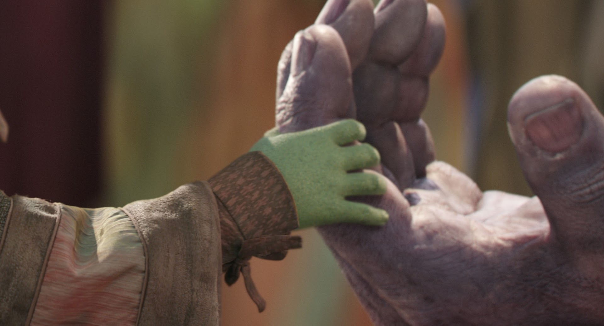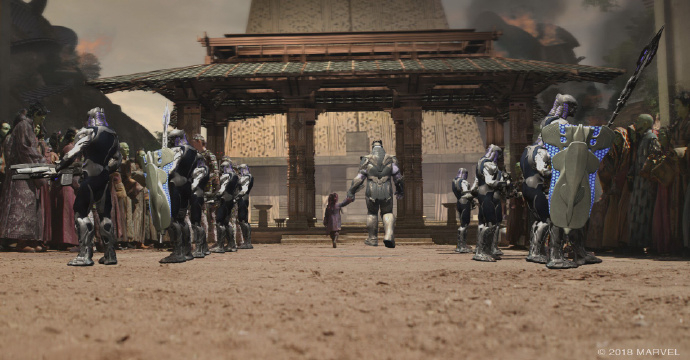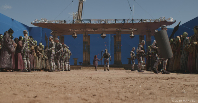 ▼原來這一幕也是藉由群眾演員來站位,再經由後至特效將多數泰坦人的身體都拉高,尤其是薩諾斯的身高一定要做出與葛摩菈有極大差距,可以看見特效前後的角色對比模樣差異極大。
