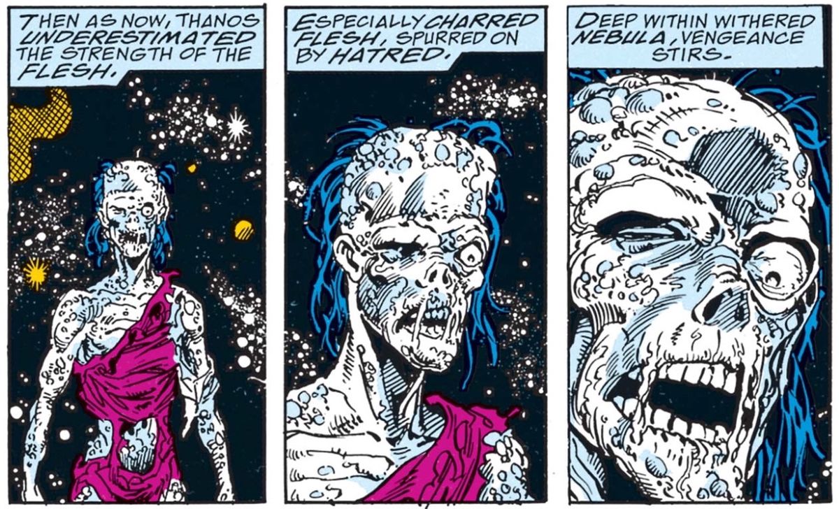 這一場戲可以說是《復仇者聯盟 3:無限之戰》令人痛苦的畫面之一,事實上在漫畫中涅布拉看起來更加悽慘,她被薩諾斯折磨成一個腦死的行屍走肉,但薩諾斯依然把涅布拉留在身邊作伴,在漫畫中她也將因此成為關鍵人物。