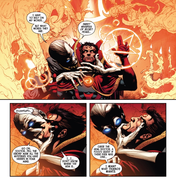 在電影中我們看見烏木喉用詭異的能量棒折磨著奇異博士,這是一段黑暗的交涉,這一幕也同樣受到漫畫《Infinity》的啟發,這一部漫畫是接續《無限手套》的續作,對於這一次的《復仇者聯盟 3》也是相當重要的劇情參考作品。