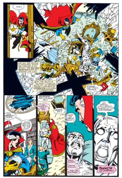 當浩克被彩虹橋傳送回地球時,他以一個極為狼狽的姿勢警告奇異博士和王:「薩諾斯就要來了!」這一幕不只是要顯示薩諾斯的強大,同時也是出自《無限手套》的漫畫鏡頭,不過作品中則是銀色衝浪手(Silver Surfer)掉進了奇異博士的聖堂裡,並大喊薩諾斯的名字。將這場景角色替換成浩克的原因,自然是因為銀色衝浪手的版權依然在二十世紀福斯之下,而之所以選擇浩克來替換銀色衝浪手的位置也是具有深意的,原來奇異博士、浩克和銀色衝浪手在漫畫中處於同一個時代,這 3 個超級英雄角色還曾經一起組成捍衛者(Defenders)團隊,即使是漫威電影也不會隨便找一個角色補上替換的。