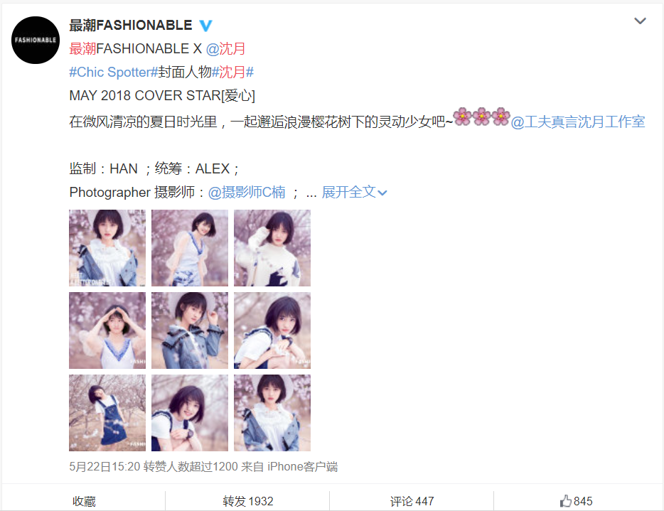 22日,大陸時尚雜誌「最潮FASHIONABLE」也在微博上發出了一組以沈月為封面的時尚大片, 以浪漫櫻花樹下的靈動少女的夏日風格為題,再度向大家展示她不同於元氣少女的另外一面。