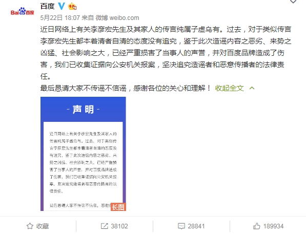 近日網路上有關李彥巨集先生及其家人的傳言純屬子虛烏有。過去,對於類似傳言李彥宏先生都本著清者自清的態度沒有追究,鑒於此次造謠內容之惡劣、來勢之兇猛、社會影響之大,已經嚴重損害了當事人的聲譽,並對百度品牌造成了傷害,我們已收集證據向公安機關報案,堅決追究造謠者和惡意傳播者的法律責任。