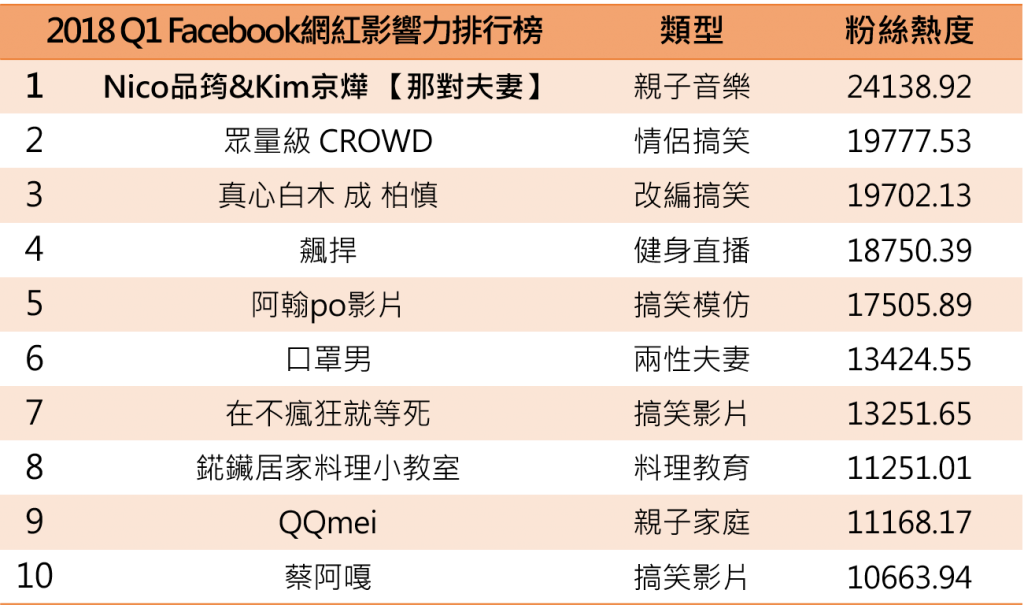 而在Facebook的超紅夫妻擋Nico品筠&Kim京燁 【那對夫妻】,在排名中得到第一,兩人育有一個超級可愛又無厘頭的女兒妮妮,小小年紀但時常說出超齡的語句,連自己爸媽都超無言,搞笑的互動在網路上擁有超高人氣,還曾出書與專輯,歌曲妮妮更是紅透半邊天,在臉書就有200萬人次追蹤。