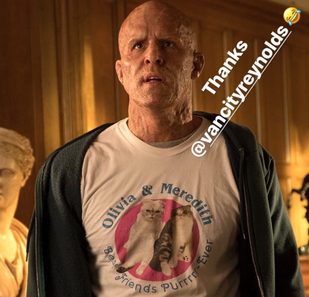 ▼原來在《死侍 2》電影中,換下死侍紅色戰袍的韋德·威爾遜穿上了 T 恤和連帽外套,來到 X 教授開設的 X 學院找鋼人和青少女彈頭,如果你是泰勒絲的粉絲,仔細一看肯定會發現萊恩雷諾斯 ( Ryan Reynolds ) 居然穿著印有泰勒絲飼養的兩隻貓咪 Meredith 和 Olivia 的白 T 恤,令泰勒絲相當驚喜,忍不住親自發出動態向萊恩雷諾斯道謝。