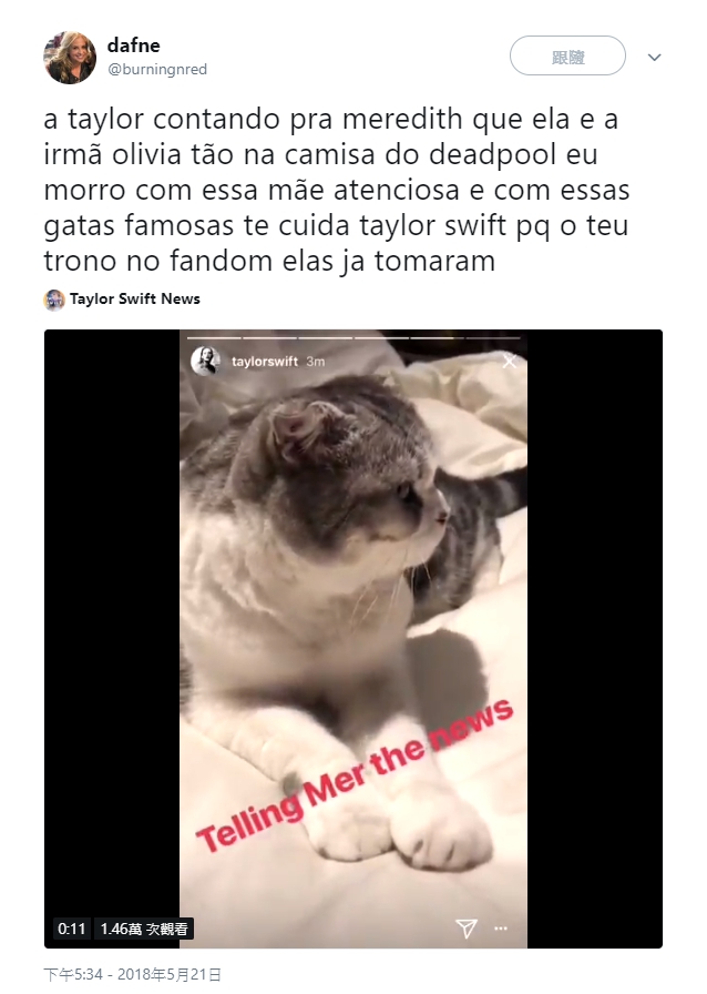 ▼當兩隻貓咪出現在《死侍 2》電影中,泰勒絲也興奮到表示:「對於我的兩隻毛女兒感到非常驕傲!」不過當泰勒絲喜孜孜地跑去告訴貓咪 Meredith 在《死侍 2》出鏡的消息時,Meredith 卻給了泰勒絲一張冷漠臉,讓粉絲爆笑。