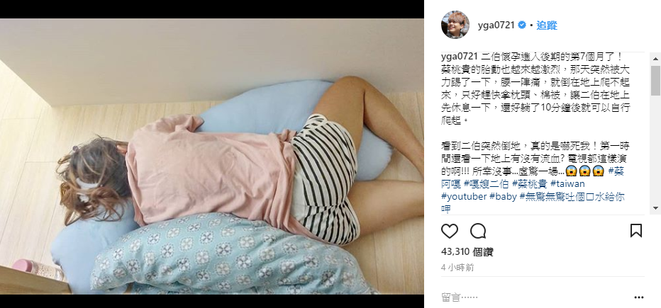 蔡阿嘎IG打上:「蔡桃貴的胎動也越來越激烈,那天突然被大力踢了一下,腰一陣痛,就倒在地上爬不起來,只好趕快拿枕頭、棉被,讓二伯在地上先休息一下」還原了當天令人慌張的過程,蔡阿嘎也表示:「看到二伯突然倒地,真的是嚇死我!第一時間還看一下地上有沒有流血? 電視都這樣演的啊!!! 所幸沒事...虛驚一場...」看的出來準爸爸真的超級緊張,雖然媽媽二伯懷孕非常辛苦,但想到蔡桃貴一定是超活潑的寶寶就令人感到溫馨與期待。