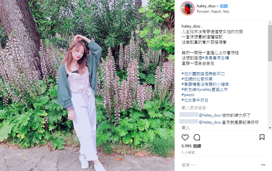 23日安小編在自己的IG「haley_duu」打上:「人生從來沒有穿過這麼女性的衣服,一直很想嘗試這種搭配,沒想到真的意外百搭滿意」只見圖片中她身穿背心,以黑色平口小可愛內襯,露出性感鎖骨!下身則搭配高腰褲,使腿的比例更加修長。而安編的配色也是十分講究,使用仙女紫搭上牛奶白,讓整個人看起來更有春夏氣息,非常好看!而她也說這樣的穿搭讓她更自由自在。