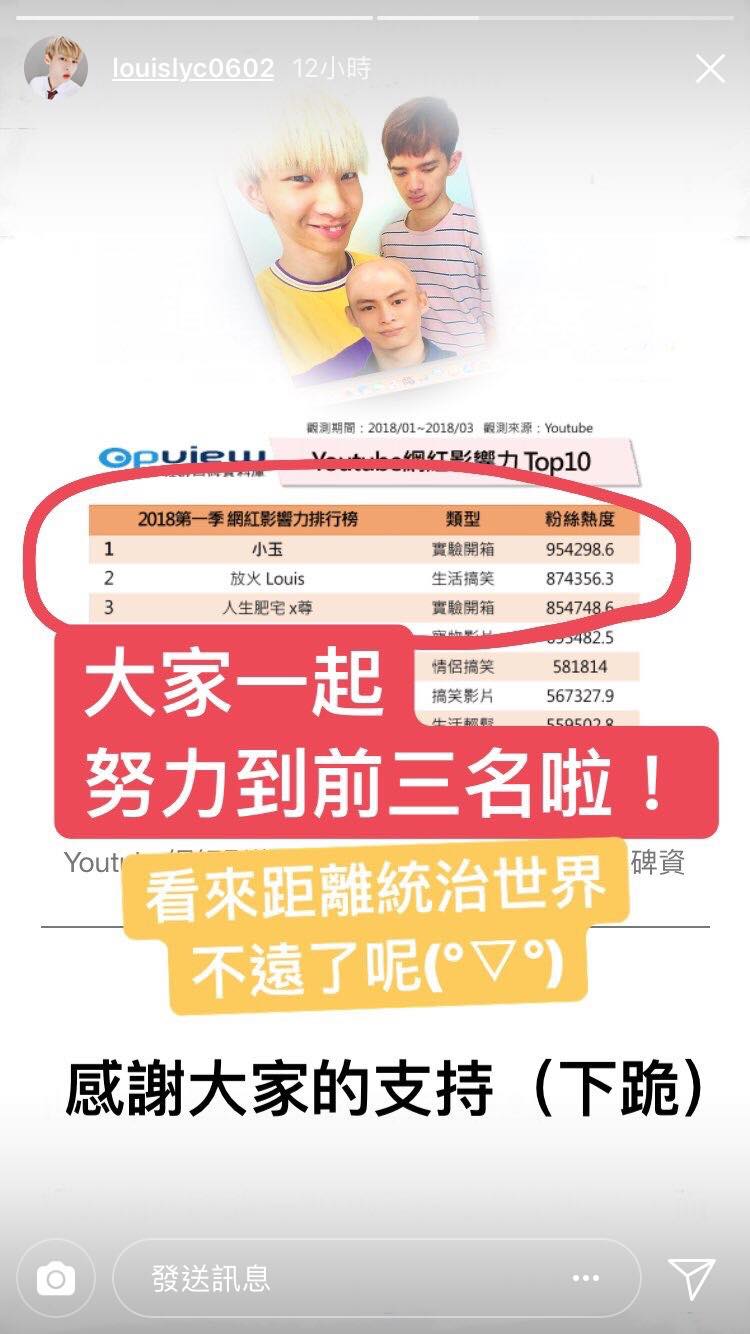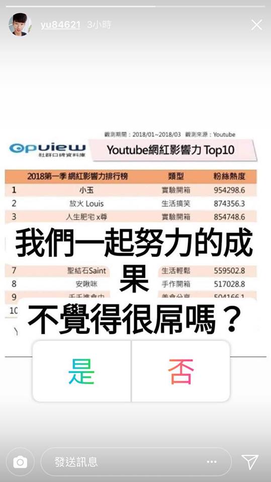 現在YouTube頻道以及Facebook等社群網站平台盛行,很多素人也能藉由發揮自己的創意在網路上走紅。近期由《OpView社群口碑資料庫》的數據之中,公布了在2018年第一季度,網紅的影響力排行榜,在YouTube頻道影響力排名之中,小玉名列第一,也讓他不禁興奮與粉絲分享,並亢奮表示「不覺得很屌嗎?」