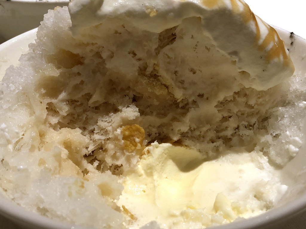 台北中山店「おいしい氷屋」的刨冰以高成本方式從日本福岡運來台灣,堅持用純冰製作。製作時間長達72小時,在結冰過程需要不斷地攪拌、注入空氣,在冰裡的雜質完全去除,才能夠達到幾近99.9%的純淨無雜質「純冰」,而這樣的冰刨出來後,會更蓬鬆、綿密,不過融化速度也比較快XDD